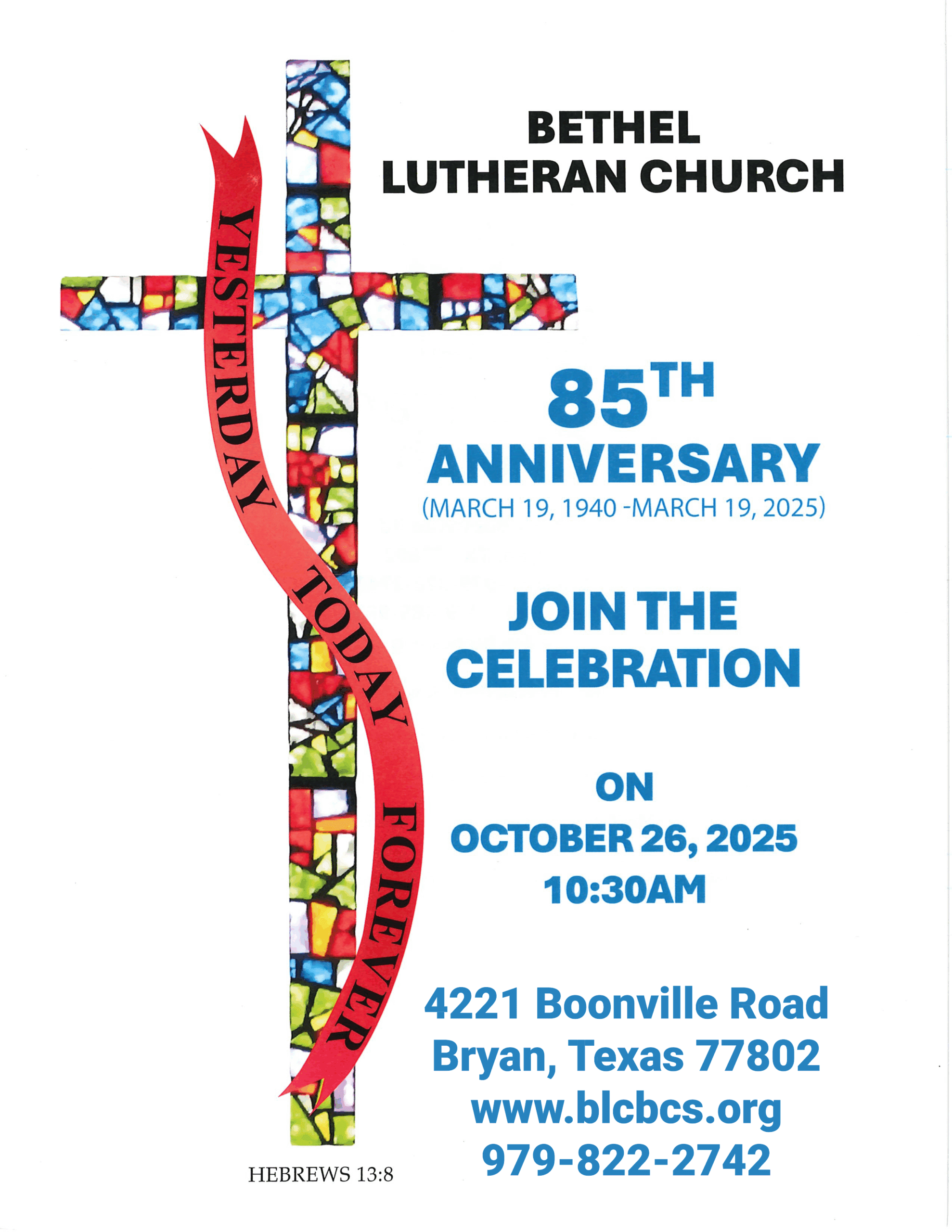 Please join us as we celebrate the 85th Anniversary of Bethel! Reformation Sunday Service at 10:30am and 85th Anniversary lunch to follow.