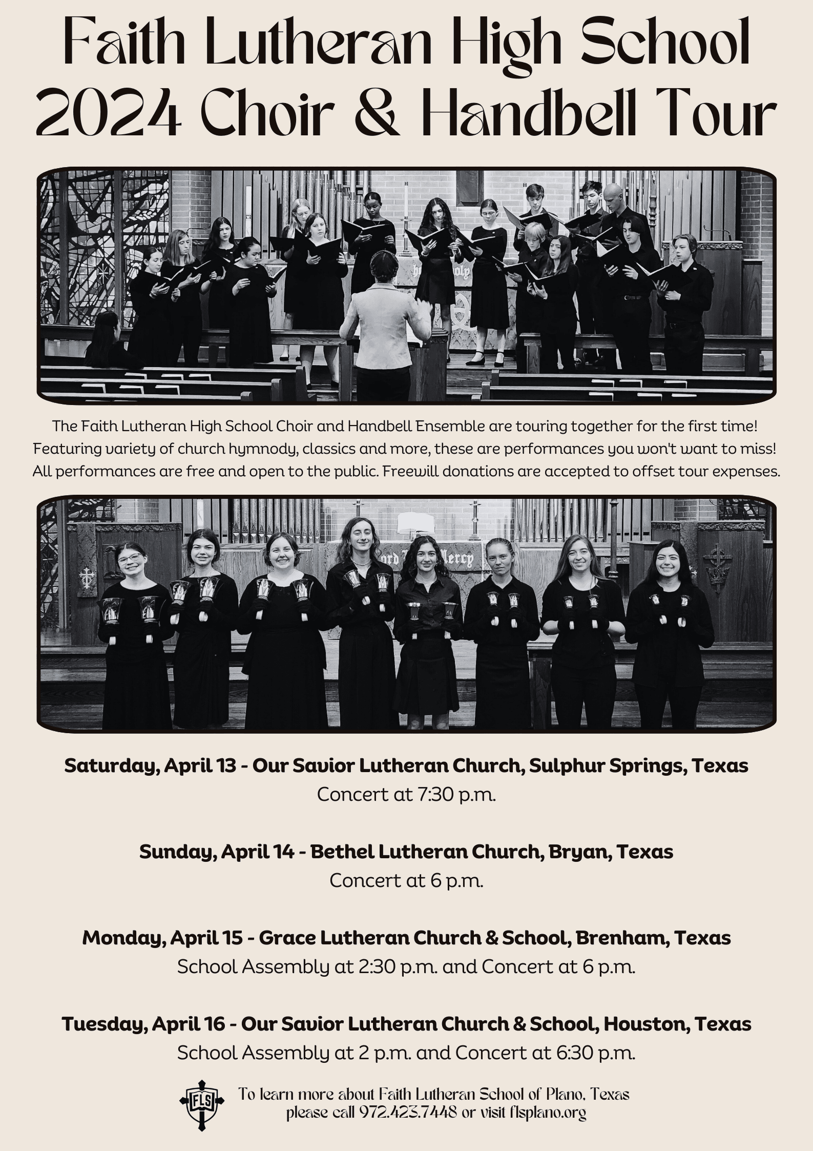 We are hosting the Faith Lutheran High School Choir and Handbells Ensemble April 14th. There will be a potluck with the choirs at 5:00 April 14th, with the concert starting at 6:00 p.m.